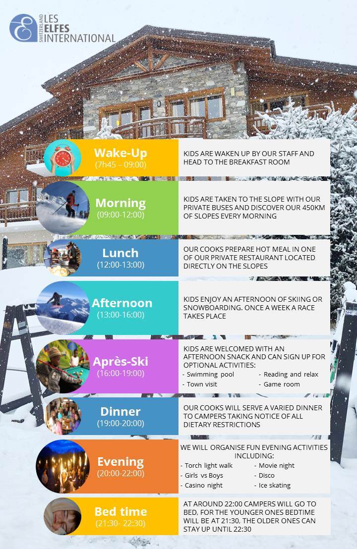 Перебування на гірськолижному курорті забезпечить баланс пригод на природі одночасно з мовними курсами, екскурсіями та вдосконаленням катання на гірських лижах та сноуборді. Кожен учасник табору може обрати заходи, які йому до вподоби: катання на санчатах, ковзанах, гра в хокей, дискотеки, майстер класи, конкурс на кращого сніговика.